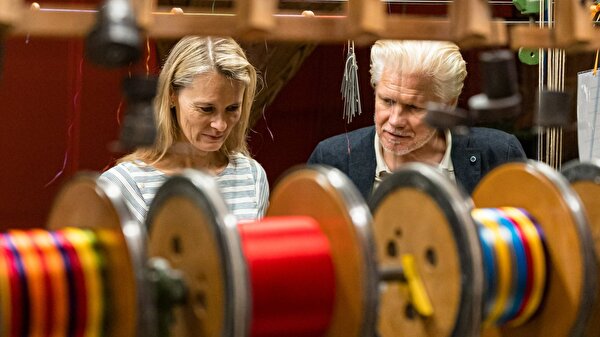 Die Weberin demonstriert die verschiedenen Bandwebstühle in der Ausstellung «Seidenband. Kapital, Kunst & Krise» und zeigt, wie mit Schiffchen und Seidenfäden Schmuckbänder entstehen. Gewoben wird an einem lochkartengesteuerten Schiffchenwebstuhl (um 1900) und einem Nadelwebstuhl (um 1970). Zu sehen ist zudem ein Schlagstuhl von 1764.