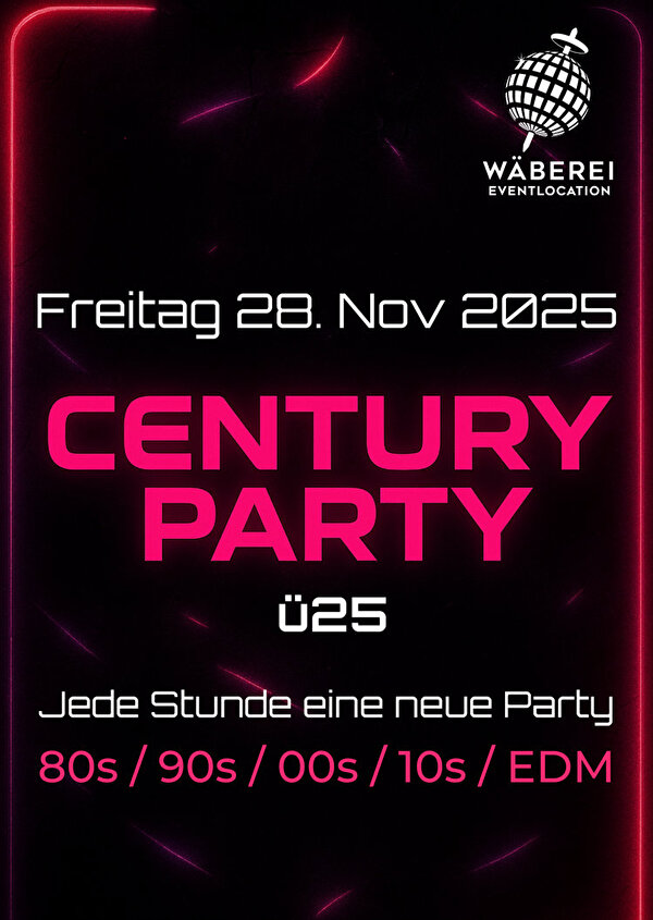 Vier Jahrzehnte. Eine Nacht. Und zum Schluss: Bass, Beat, Ekstase. Die WÄBEREI lädt wieder zur Century Party Ü25 - dem Partyformat, das Musikgeschichte feiert wie sonst niemand. Eine Nacht, vier Jahrzehnte voller Kult-Hits und zum krönenden Abschluss: eine elektronische Afterhour, die bis in die frühen Morgenstunden pulsiert.