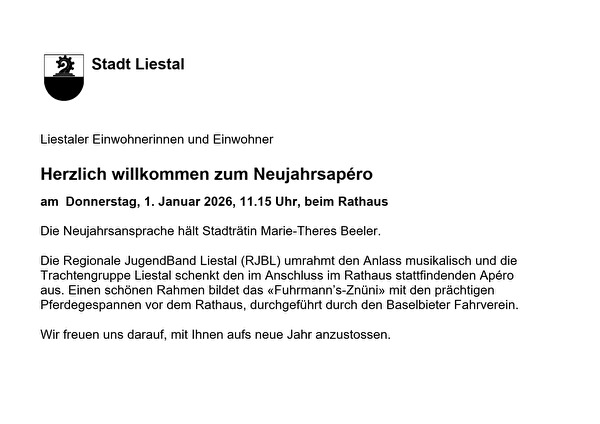 Neujahrsapéro für die Einwohnerinnen und Einwohner der Stadt Liestal